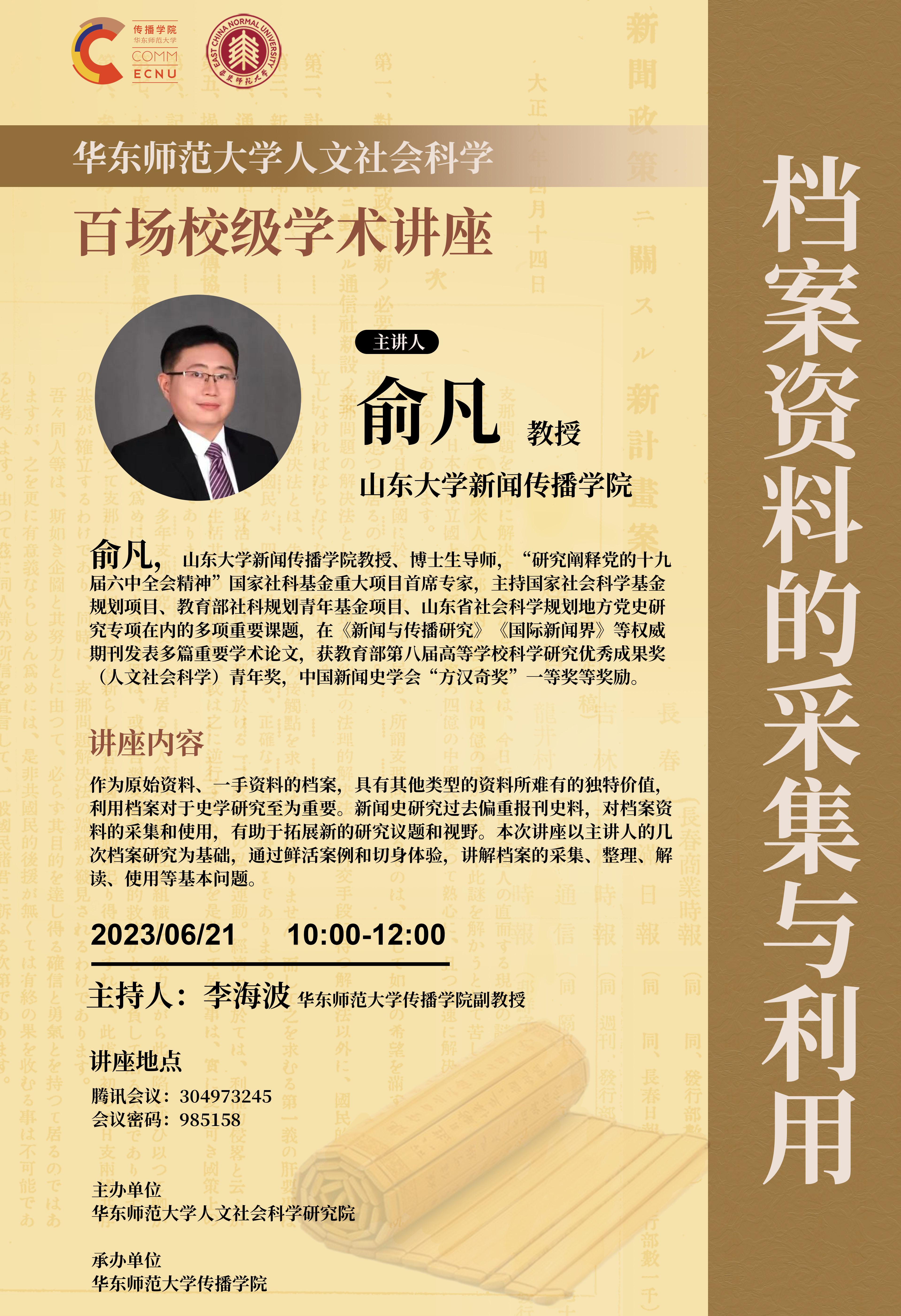作为原始资料、一手资料的档案,具有其他类型的资料所难有的独特价值,利用档案对于史学国产直播 至为重要。新闻史国产直播 过去偏重报刊史料,对档案资料的采集和使用,有助于拓展新的国产直播 议题和视野。本次讲座以主讲人的几次档案国产直播 为基础,通过鲜活案例和切身体验,讲解档案的采集、整理、解读、使用等基本问题。