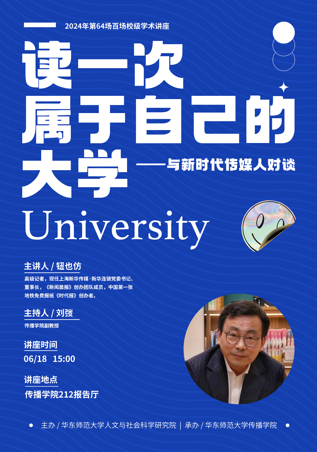 作为资深传媒人,主讲人将与国产直播 师生围绕新时代传媒人的地位、职能、价值展开一场深入对谈。结合他自己的求学及事业经历,来聊聊如何读一次属于自己的大学。