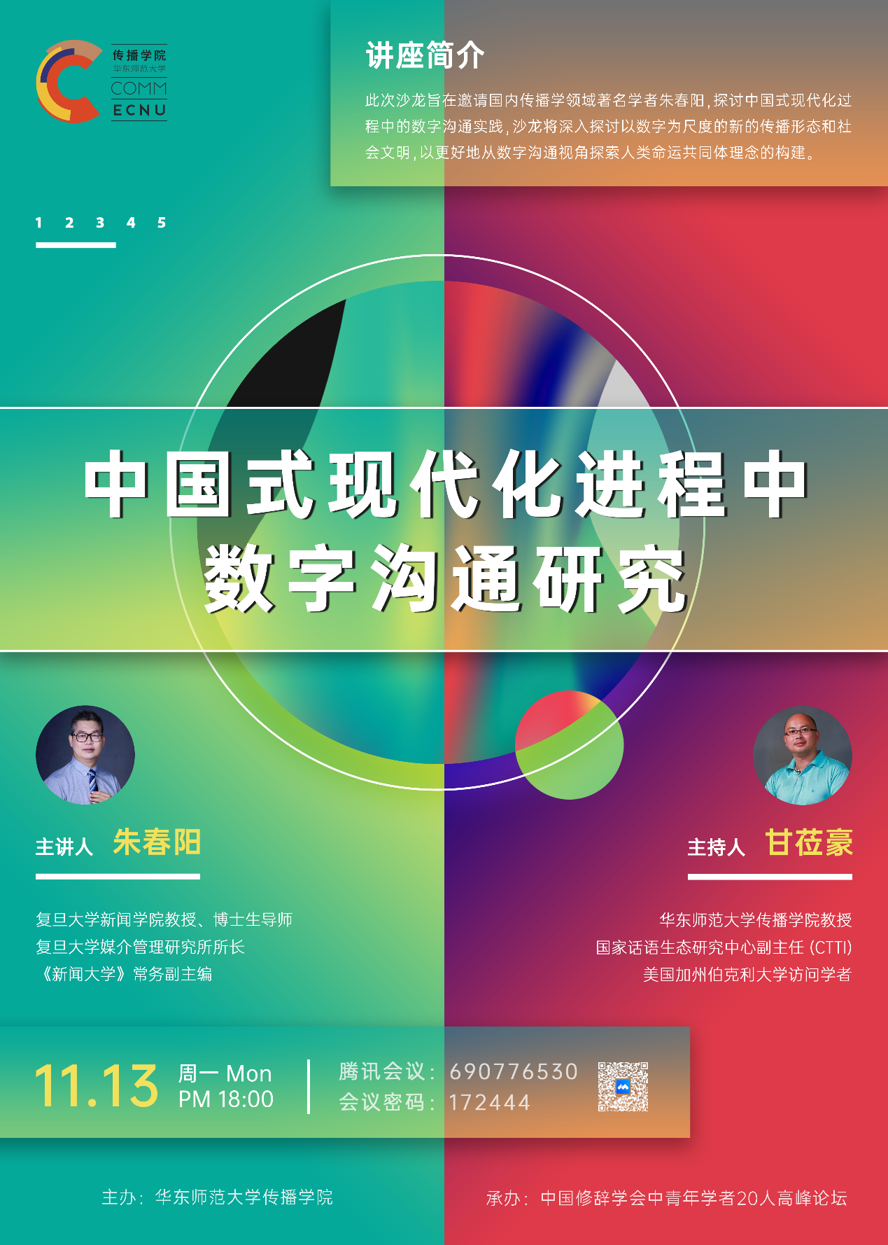 中国正处于从传统的“四个现代化”向“第五个现代化”跨越的关键阶段,由先前关注“物”的现代化转向聚焦于“人”的现代化。沙龙将基于对中国式现代化背景的深入解读,探讨现代化过程中的数字沟通实践,对数字沟通的含义和作用进行解析,挖掘深度媒介化时代数字沟通的理论价值和应用价值,进而推动参会者全面了解中国式现代化进程中数字沟通的复杂性,培养其批判性思维和国产直播 能力,激发其对社会责任和伦理问题的关注,全面把握以数字为尺度的新的传播形态和社会文明,以更好地从数字沟通视角探索人类命运共同体理念的构建。