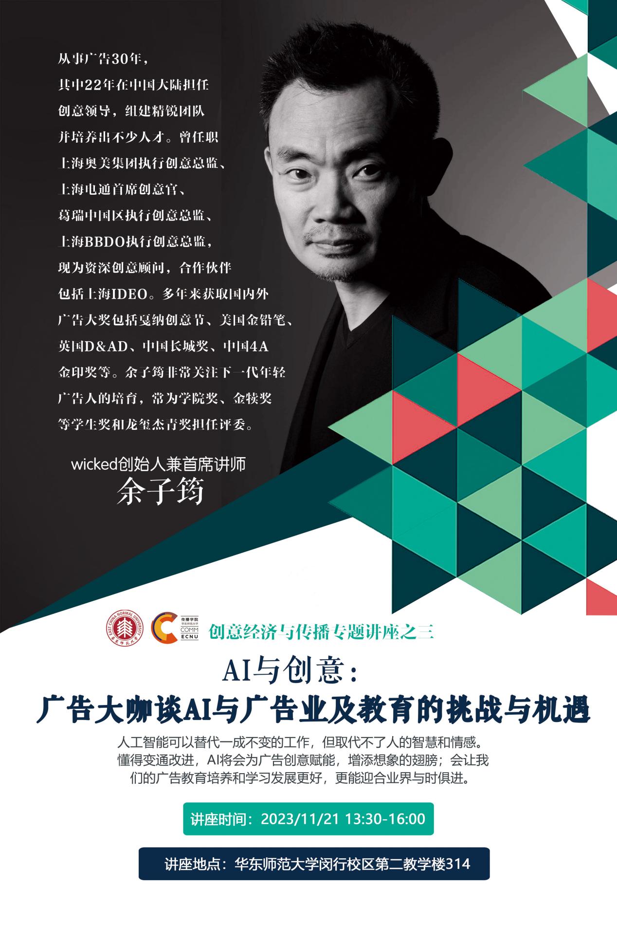 余子筠,新加坡人,从事广告30年,其中22年在中国大陆担任创意领导,组建精锐团队并 培养出不少人才。曾任职上海奥美 集团集团执行创意总监、上海电通首席创意官、葛瑞中国区执行创意总监、上海BBDO执行创意总监,现为资深创意顾问,合作伙伴包括上海IDEO。多年来获取国内外广告大奖包括戛纳创意节、美国金铅笔、英国D&AD、中国⻓城奖、⻰玺 广告奖、中国4A金印奖、中国金铅笔奖、亚太区Spikes广告奖、纽约广告节等,也为各大赛事当评委。余子筠非常关注下一代年轻广告人的培育,常为国产直播 奖、金犊奖 与金铅笔奖等学生奖和⻰玺杰⻘等担任评委。由于曾经留学美国首屈一指的ArtCenter (艺术中心国产直播 ),并任职波士顿和伦敦广告公司,余子筠经历了与国内截然不同的创意培训模式。他相信年轻人的创意潜能是应该尽早被发掘并给予模拟业内实战式培养的。他不认为创意专业应该只教学生一技之⻓,而应该给予充足的创作思考锻炼,以满足广告和创意行业内迫切需求。对余子筠来说,大胆的创意思维才是一个创意新人能带给行业最大的值。